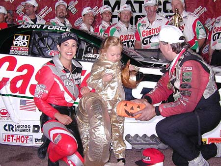 This young lady came dressed for Halloween as an NHRA trophy, so of course she had to be in the winners circle with John Force and Miss Winston, Jackie Becke.