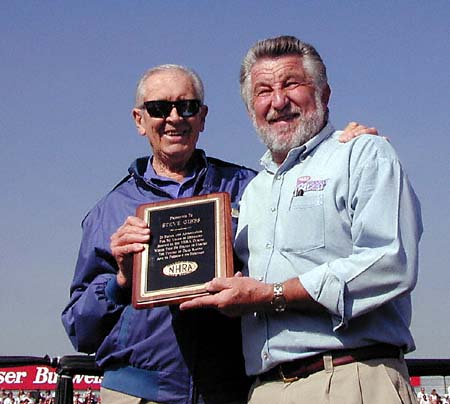Wally Parks presented a plaque to Steve Gibbs honoring him for his 30 years of service to NHRA.