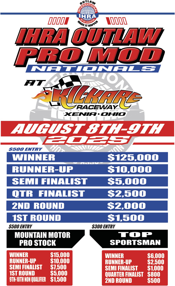 FAIRFIELD, Ohio - Starting in 1971, the International Hot Rod Association [IHRA] has embraced its roots in drag racing as a trendsetter. A new IHRA has chosen three of its staple categories, bona fide trendsetters, to showcase the return of the series purchased by Darryl Cuttell. The IHRA Outlaw Pro Mod Nationals will take place at Kil-Kare Raceway on August 8-9, in a throwback to the old Nitrous Nationals format, featuring multiple classes including Pro Modified, Mountain Motor Pro Stock, and Top Sportsman. The marquee category, Pro Modified, offers a winner's purse of $125,000. Mountain Motor Pro Stock will pay $15,000 to the winner, while Top Sportsman will have a payout of $6,000 to win. Two of the three categories in competition at this event are homegrown under the IHRA sanction. Pro Modified grew out of the Top Sportsman division, most notably the Saturday evening Quick Eight races, and was granted professional status with its debut in March 1990 at Darlington Dragway. Mountain Motor Pro Stock drag racing also debuted in Darlington in 1977, when IHRA broke away from the traditional pounds-per-cubic-inch formula and developed an unlimited displacement format, separating itself from the two other major sanctioning bodies in operation. Top Sportsman is a spinoff of the old AHRA's Top Comp Eliminator. It grew from a 64-car bracket category called Pro Street and underwent multiple name changes before settling on Top Sportsman in 1985. The class was a mix of doorslammers, dragsters, and roadsters until 1993, when it became a full-bodied division exclusively. The IHRA's return will showcase these foundational categories of doorslammer racing. The IHRA Outlaw Pro Mod Nationals will include three qualifying sessions for each class on Friday, followed by eliminations on Saturday. After the final qualifying session, a chip draw will be held for all three categories. Additionally, Friday night will feature a unique Crown Vic charity race at the neighboring Speedway, where pairs of competitors (those who are scheduled to race one another in eliminations) will pair up to race in Crown Victorias. The first-round winners will compete for a $5,000 donation to a charity of their choice through a 50-lap feature, with each driver covering 25 laps.