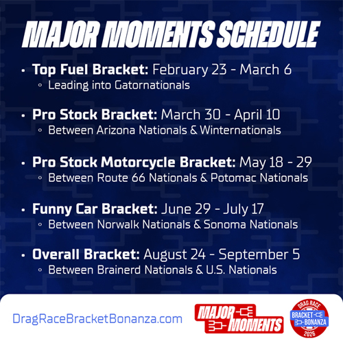 Fans can begin voting in the Top Fuel Major Moments bracket at DragRaceBracketBonanza.com. They can