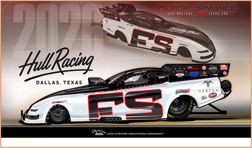 DALLAS --- Hull Racing led by team owner and driver Buddy Hull will start the 2026 NHRA Mission Foods Drag Racing Series at the historic Gatornationals with new sponsor and marketing partner FS Performance and Sam Pack Ford on their 12,000-horspowered Funny Car. The design will mirror the 2025 high performance Mustang GT Premium that the dealership designed at the end of the year. The limited-edition Ford Mustang "Buddy Hull" specialty car is inspired by the same grit, attitude and adrenaline that drives his Nitro Funny Car program. Over the off-season Hull Racing led by crew chiefs Mike Guger and Matt Bynum have been preparing for the season opener. "We are taking the opportunity to work with Sam Pack Ford and FS Performance to the next level," said Hull. "It is one thing to have a car on display, but when you can put that car on the racetrack at the Gatornationals in front of the whole world of drag racing that will be so cool. I was able to be a part of the Mustang GT Premium design process and give them ideas on the performance levels of the Mustang as well as styling suggestions to make it very personal to my brand. I have been doing the same thing with Mike (Guger), Matt (Bynum) and the team on the big show Funny Car."