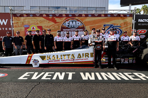 THREE TIME TOP FUEL WINNER: Qualifying: Shawn Langdon was the No. 1 qualifier at the FMP NHRA Arizona Nationals. It was his first No. 1 qualifier of the season and the 23rd of his career. Langdon's best qualifying attempt came in the Friday morning session when the Kalitta Air Careers dragster reached the finish line in 3.783 seconds at 331.36 mph. Due to record head with temperatures above 100 degrees, qualifying began at 10 a.m. on Friday and Saturday. Eliminations: Under scorching summer-like temperatures and a track temperature approaching 150 degrees in the afternoon, Langdon had a bye in the first round and then defeated Tony Schumacher and Maddi Gordon to reach the final round against Leah Pruett. Langdon was off the starting line first and never trailed posting a 3.877 second pass at 325.45 mph to take his third-straight win at Firebird Motorsports Park. Langdon and the Kalitta Air Careers team have won 12-consecutive rounds of racing at the suburban Phoenix track. The Langdon-Brian Husen driver-crew chief combination is undefeated at this track. When Langdon advanced to the semifinals, he earned a spot in the Mission #2Fast2Tasty NHRA Challenge at the next race in Pomona, Calif. During Saturday's qualifying sessions, the drivers who reached the semifinals in Phoenix will re-run the semifinals and final earning additional purse and championship bonus points. Unofficial Point Standings: Langdon leaves Phoenix in third place in the NHRA Top Fuel point standings. He trails second-place Josh Hart by four points and leads fourth-place Leah Pruett by 12 points. Langdon on Phoenix: "It's all about the team and surrounding yourself with good people. Connie (Team Owner Connie Kalitta) isn't here this weekend, but I'm sure he was watching. It's great to win here again. I'm so proud of our team being able to do what they did with some of the hottest conditions we've ever seen, Brian (Crew Chief Brian Husen) was able to make the adjustments. With the heat, it wasn't ideal, but we all dealt with it, and the track did fairly well with the temperatures we had. It wasn't fast racing, but it was good racing. "We have a pretty good run going here in Phoenix, so we might need to talk to NHRA about putting on a second race here, but to win three straight here is a credit to my team. Brian and the guys have done such a great job over the last three years. It's cool to be able to have a track like that where you have a lot of confidence. It's all Brian. I just I hold the steering wheel straight. It's Brian's work ethic, his determination, and his passion for the sport. He's made everybody better; all the crew guys; me as a driver, and it's just every little thing. For him, it's always in the details, like he always says. I just try to leave on time and hold the steering wheel straight and just let Brian's talent speak for itself. "Luckily, the driver gets to go into the air conditioning and put a towel over his head, but the crew guys don't get that luxury. This one is definitely for them, They battled the heat, did a great job with it, and the car was great all day today. "Some little issues with the car popped up throughout the day, and the cool thing about being a part of this team is that even though you won the race, they're still looking at the finer details. Brian demands perfection. If the car's not perfect, we're gonna make it perfect so we're staying to test tomorrow, even though we won the race, to try to make the car better for Pomona." Crew Chief Brian Husen on Phoenix: "Man, it's been a really tough weekend for everybody out here trying to race (in the heat). We just kind of kept picking away and picking away and picking away at it, and finally on a hot racetrack, we kind of got it all put together in the right way, and made a pretty solid run. I'm pretty happy with that. These Kalitta Air Careers crew guys that work on this car, all of my guys, they're so good at what they do, and they never make mistakes. They drag their stuff up here, and it always runs what we think it should run, even if it smokes the tires, so all the credit goes to those guys. I couldn't be more happy for Connie and Shawn and the whole Kalitta Motorsports gang."