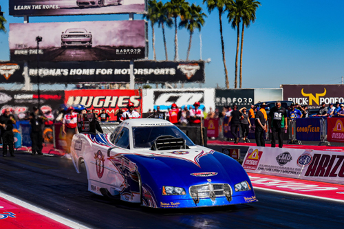 PHOENIX --- Coming into the FMP NHRA Arizona Nationals this weekend at Firebird Motorsports Park rising star Dylan Winefsky was looking to continue to improve his driving skills and Funny Car performance. The Arizona-based driver executed masterfully on both fronts, posting career best elapsed times and speeds throughout the race. Winefsky qualified No. 14 and faced a tough first round opponent, Gatornationals winner and points leader Chad Green. Driving the Nitro Moose Funny Car with sponsorship support from Lowe's Home Improvement, Audio Express, Robert's Car Care, Bob Jackson Auto Body, and Outlaw Race Engines, Winefsky made a strong run in the first round coming up just short to Green. "We just kept improving with every run this weekend," said Winefsky. "Even the last run in the first round when the belt broke, we had our best 60-foot and our best 330-foot time. We can carry all this momentum into Pomona and keep everything the same, we should improve even more Pomona, especially with better air."