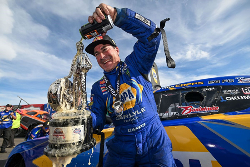 "This is the coveted one right here," Capps said as he held up the trophy. "You just think of the legacy and what's gone into this. This is unbelievable. Thank you to Wally Parks, first of all. Katherine (Wooten) and everyone at NAPA, all the NAPA Auto Care people. We knew this was going to be a battle of attrition and dropped cylinders today. A couple of those runs, there was no way I would imagine that would have got us lane choice, but it did. It was like a bracket car. This win reminded me a lot of first my win in St. Louis [1997] because it was hot and we had 150-degree track temps there and we dropped cylinders all day but still won the race.