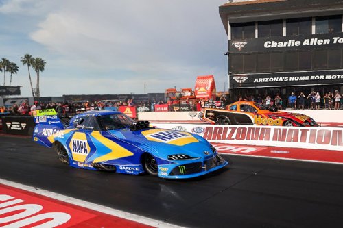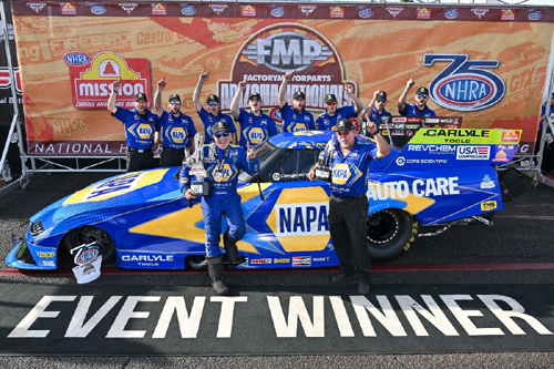 CHANDLER, Ariz. - Ron Capps and the NAPA Auto Care Funny Car team turned chaos into a commanding victory Sunday afternoon at the NHRA Arizona Nationals at Firebird Motorsports Park. The three-time world champion overcame a rocky start in qualifying and bounced back from an engine explosion in the quarterfinals to earn his 78th career national event Wally and his 10th since becoming a team owner in 2022. The veteran wheelman set low E.T. of all four elimination rounds, including the final, where he defeated second-year driver Spencer Hyde. Capps is now ranked third in the NHRA Mission Foods Drag Racing Series Funny Car points standings.