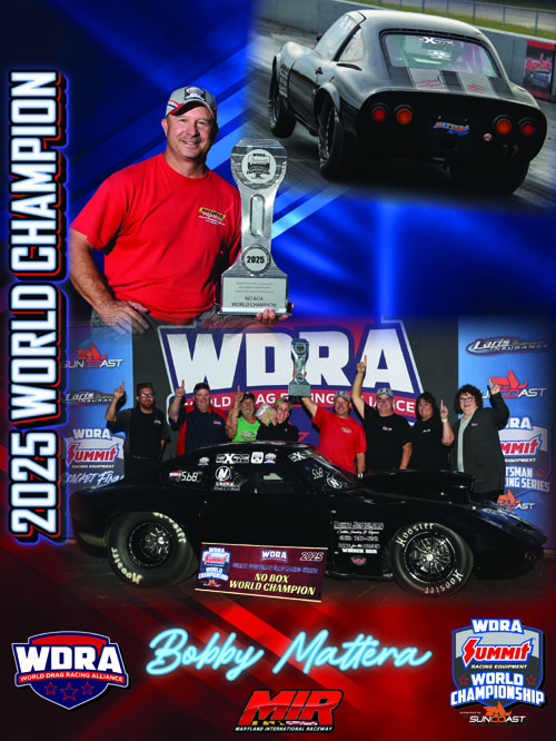 2025 WDRA Summit Bracket Finals and World Championships. MONTGOMERY, Ala. -- A common theme throughout drag racing is how often fellow competitors become like family through their shared passion for the sport. For the newly named 2025 WDRA Summit No Box World Champion, Bobby Mattera, his biological family is also ingrained throughout the staging lanes. Mattera became casually involved in drag racing shortly after graduating high school, thanks to the introduction from his oldest brother, Joey. After a few years of racing, including a Super Pro Track Championship in 1991, Mattera hung up his helmet in 2001 when his twin daughters, Allyson and Megan, were born prematurely. He admits he never planned on getting back behind the wheel, but in 2013, he was offered an opportunity to drive a Buick Opel, which eventually found its way into the most prestigious winner's circle a dozen years later. He explained, "My youngest brother, Danny, was driving the Opel for a friend of his named Joe Brown. They were going to buy a 1968 Camaro, so they asked if I would have any interest in driving the Opel, and I said, 'Sure, why not?' They were going to pay for everything, and we would split whatever I won. I drove it for two years for them, and in 2015, I ended up buying the car." That first year back on track, Mattera led the points chase all season but lost the track championship by one point on the last race. Those winning ways would continue, eventually earning four track championships and six invitations to the world championship-crowning events between the WDRA and IHRA. Due to issues with the motorhome, he was unable to make the trip last year; therefore, this was his first experience at the WDRA Summit World Championships presented by SunCoast Performance. However, Mattera is no stranger to impressive final-round appearances, having earned three bracket finals main event victories within the last four seasons (IHRA in 2022, WDRA in 2024, and 2025). Last year, he cemented his Maryland International Raceway (MIR) track championship by claiming both the Race of Champions and main event wins at the WDRA Summit Eastern Bracket Finals. When asked how it felt to continue claiming such extraordinary victories, Mattera quipped, "It feels just as good. It never gets boring to win!" This season, he finished third in the MIR No Box points but was the WDRA Summit Sportsman Drag Racing Series representative for the track alongside his second consecutive WDRA Summit Eastern Bracket Finals championship, skillfully earning his invitation to Montgomery International Dragway. Mattera reveals he wasn't entirely convinced to make the journey from Maryland to Alabama until his brother qualified by winning the MIR Box track championship. He explained, "I knew that Joey was going to go if he won the track championship, so then it was no doubt that we had to go. It's the first time that two of us have gone down together and been in the world finals. My brother, Tony, has been in the world finals a couple of times in Mod, but we've never qualified the same year." That decision turned out to be a profitable one for both brothers, as Joey won the Advanced Product Design free-entry Friday $5,000 Box victory and finished fifth in the national top ten standings, following a quarterfinal exit in the main event. Of course, Bobby edged out the awards for the weekend by coming home with the number one spot in the No Box standings and a hefty $20,000 cash payout. On his way to the winner's circle, Mattera would face off with Benny Combs (London Dragway), the reigning No Box World Champion; Drew Buchner (St. Thomas Dragway), Clark Doukas (I-29 Dragway), Brian Yerger Jr (WDRA Southeast Bracket Finals), and Matt Luckett (Windy Hollow Dragway) before the life-changing final round. Mattera was four thousandths behind on the starting line but earned the .013 margin of victory over Zach Livingston (Eddyville Raceway Park) by running dead-on his dial-in for the third consecutive round. In addition to the cash and prestigious title, he earned a WDRA Champion Card and the iconic WDRA Rod Trophy. When asked to talk through his thought process for the weekend, Mattera said, "I definitely felt like my concentration level was a lot better on Saturday than it was on Friday. I guess knowing it meant a lot more, the focus was there a little better. I [race] more kind of in the zone. You got to realize that everyone there is tough, everybody there is a champion, and anybody can win that race. Things just happened to work out good for me that day." Mattera's skill certainly aided in his success, with an average reaction time of .015 throughout the six rounds of competition, and his worst light of .024 appearing in the final round. Consistently awaiting the third amber during undoubtedly one of the most pressure-inducing events of the season is likely attributed to his overall calm demeanor and experience in high-stress situations, gained throughout his twenty-two-year career with the Capitol police force. He admits that some nerves creep up, but they are quickly extinguished. "I do get a little nervous prior to going to the burnout box," he explained," But once we start the burnout, all that is out the window and you got to focus on what you need to do and know what you have to get done." When asked to share his immediate thoughts when the final win light turned on, Mattera said, "A bit of relief and lots of emotion. This is the most money I've ever won, and you go to big money bracket races where there's a lot of heavy hitters, but the world finals are all champions, and so that's definitely a big deal as well." A big deal is an understatement, and Mattera proficiently stamped his name into the record books by becoming the first WDRA World Champion to also secure a WDRA Bracket Finals championship in the same season. He is also the first to achieve either accolade in the Mattera family, which is full of drag racers, including his four brothers, nieces