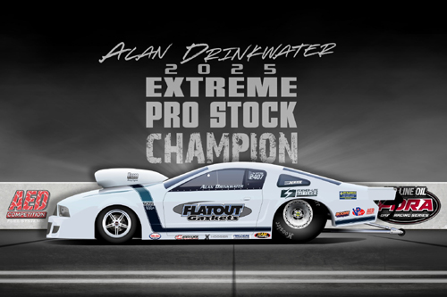 FREDERICKSBURG, Va. - Two years after Alan Drinkwater hoisted his first Red Line Oil PDRA Drag Racing Series world championship trophy, the Florida native captured another title in AED Competition Extreme Pro Stock to close out the 2025 season. Drinkwater in his Kaase-powered Flatout Gaskets '08 Mustang won four races in five final-round appearances across the seven-race season to become just the fourth driver in series history to win multiple Extreme Pro Stock world championships. After winning the 2023 PDRA Extreme Pro Stock title, Drinkwater and his team took a year off from PDRA competition. When they returned at the 2025 season-opening East Coast Nationals at GALOT Motorsports Park, Drinkwater raced to a runner-up finish behind defending world champion Chris Powers. Two races later, Drinkwater made it back to the winner's circle when he defeated Mountain Motor Pro Stock veteran Elijah Morton in the final round at the North vs. South Shootout at Maryland International Raceway.