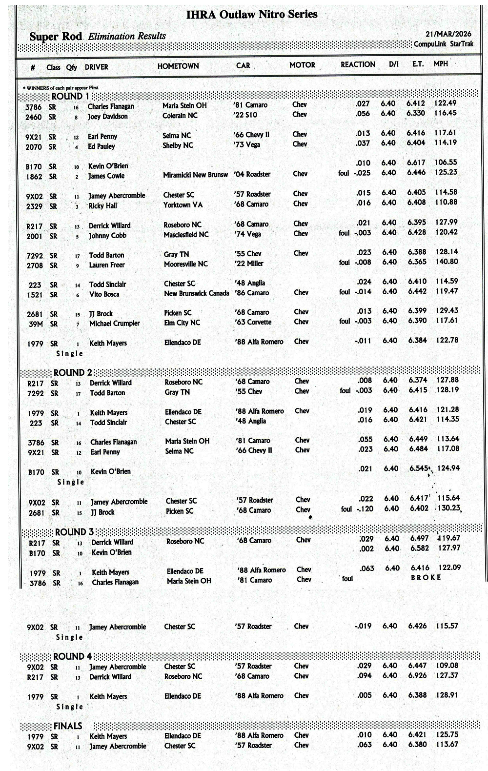 BENSON, N.C. - Summary of eliminations in Super Rod at the Outlaw Nitro Series, event at Darana Motorsports Park.
