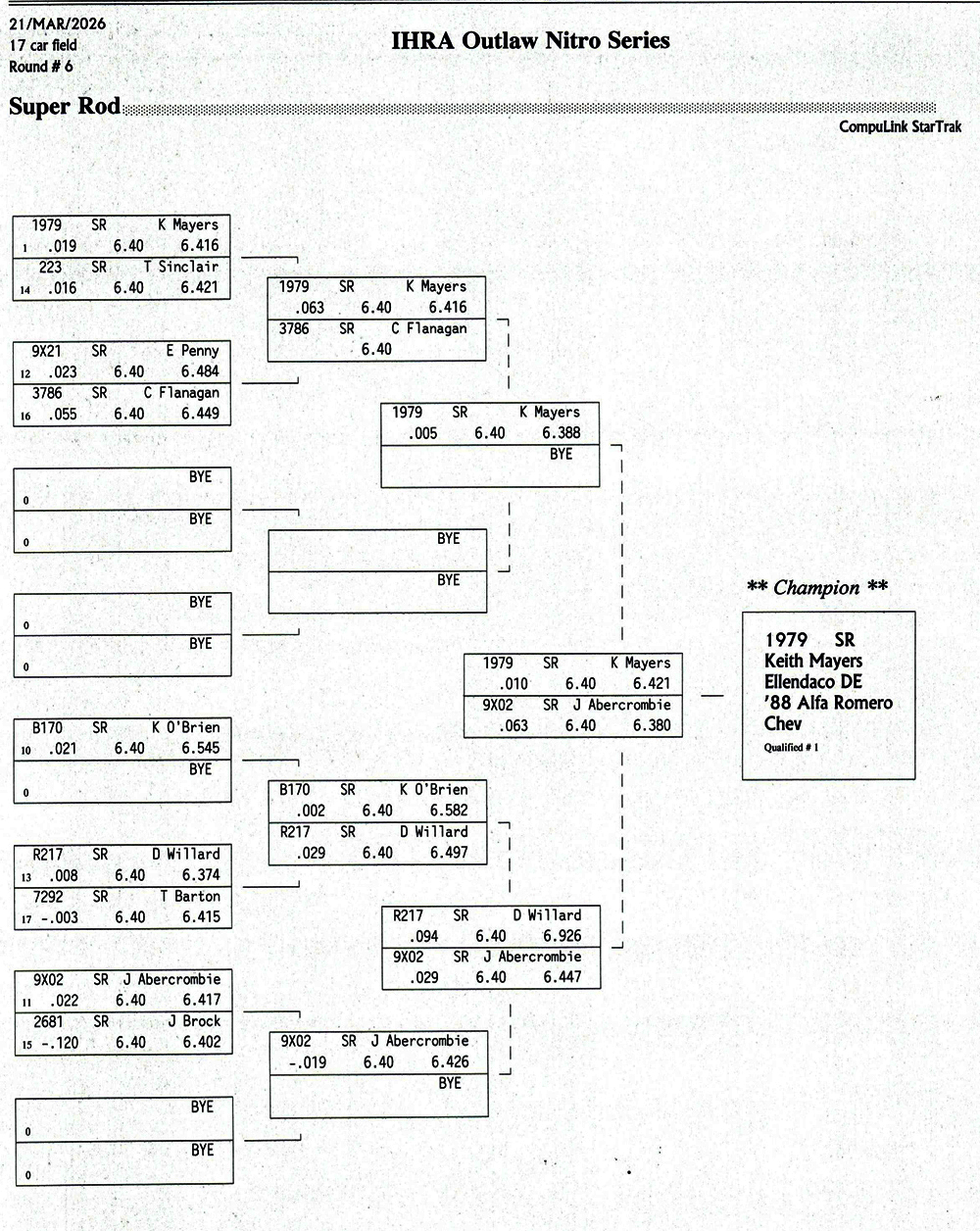 BENSON, N.C. - Final eliminations ladder in Super Rod at the Outlaw Nitro Series, event at Darana Motorsports Park.