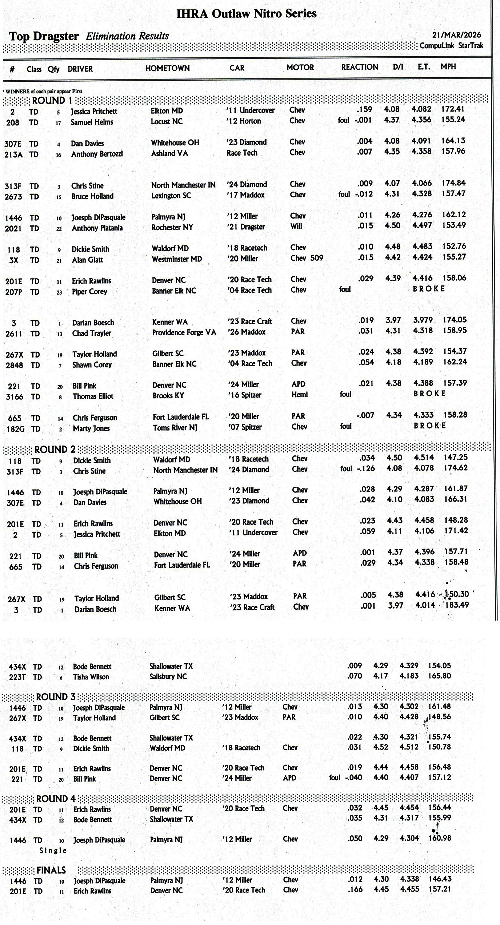 BENSON, N.C. - Summary of eliminations in Top Dragster at the Outlaw Nitro Series, event at Darana Motorsports Park.