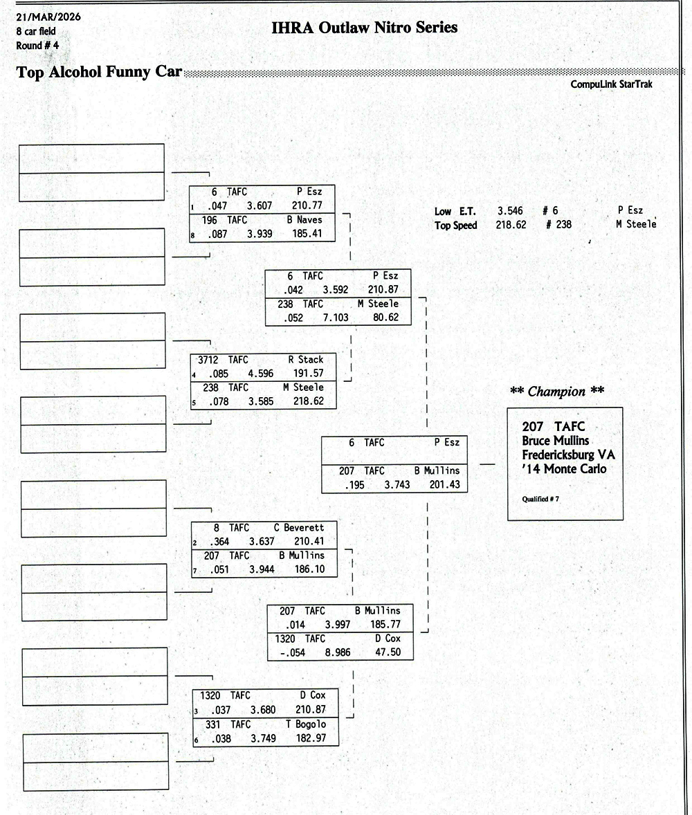 BENSON, N.C. - Final eliminations ladder in Top Alcohol Funny Car at the Outlaw Nitro Series, event at Darana Motorsports Park.