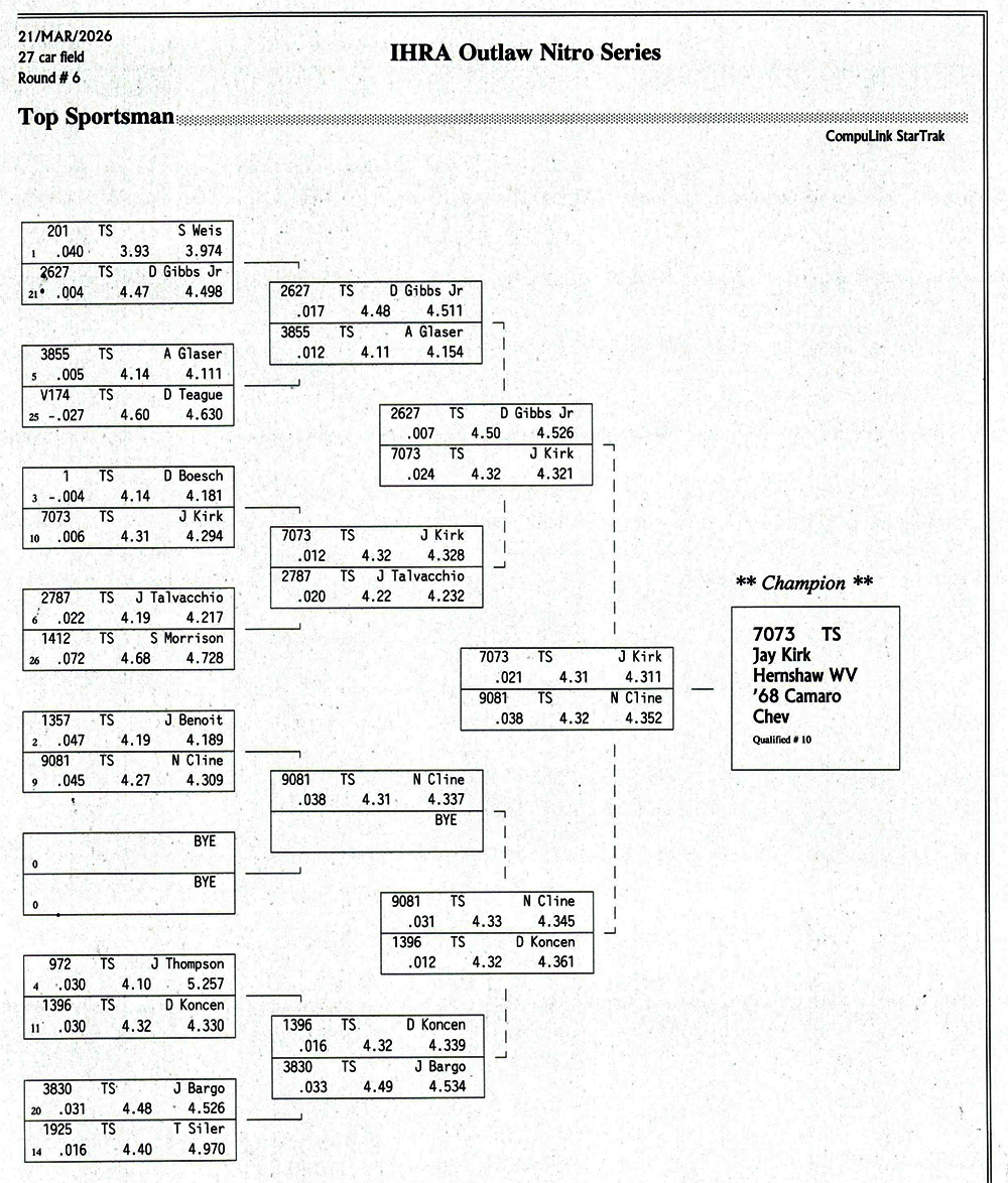 BENSON, N.C. - Final eliminations ladder in Top Sportsman at the Outlaw Nitro Series, event at Darana Motorsports Park.