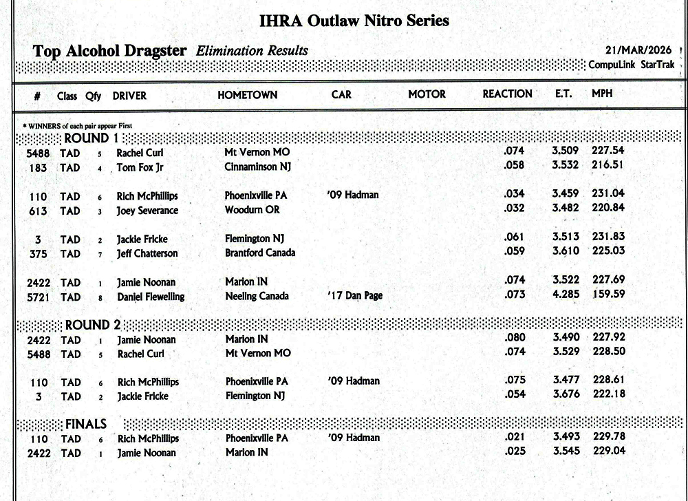 BENSON, N.C. - Summary of eliminations in Top Alcohol Dragster at the Outlaw Nitro Series, event at Darana Motorsports Park.