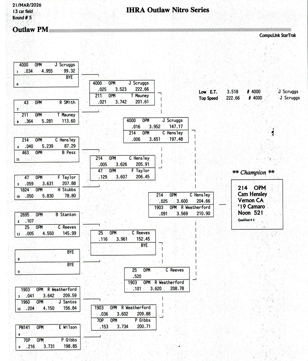 IHRA: 10 Most Recent Entries [ top ] Mar 31- IHRA Acquires Frank Hawley's Drag Racing School Mar 22- BENSON - Top Fuel Final Ladder Mar 22- BENSON - Summary of Eliminations in Top Fuel Mar 22- BENSON - Funny Car Final Ladder Mar 22- BENSON - Summary of Eliminations in Funny Car Mar 22- BENSON - Pro Mod Final Ladder Mar 22- BENSON - Summary of Eliminations in Pro Mod Mar 22- BENSON - Nitro Harley Final Ladder Mar 22- BENSON - Summary of Eliminations in Nitro Harley Mar 22- BENSON - Summary of Eliminations in Pro Stock