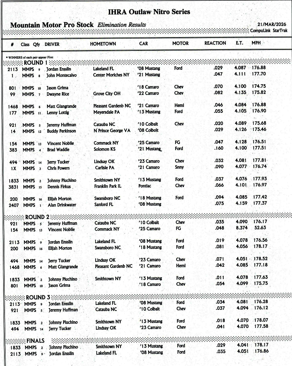 BENSON, N.C. - Summary of eliminations in Mountain Motor Pro Stock at the Outlaw Nitro Series, event at Darana Motorsports Park.