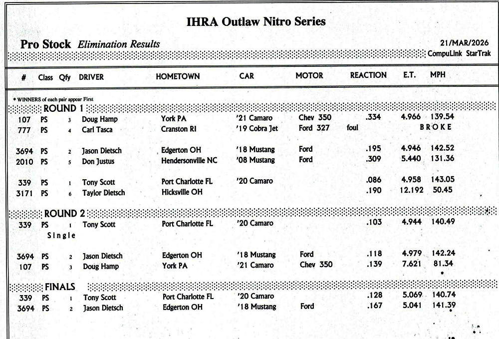 BENSON, N.C. - Summary of eliminations in Pro Stock at the Outlaw Nitro Series, event at Darana Motorsports Park.