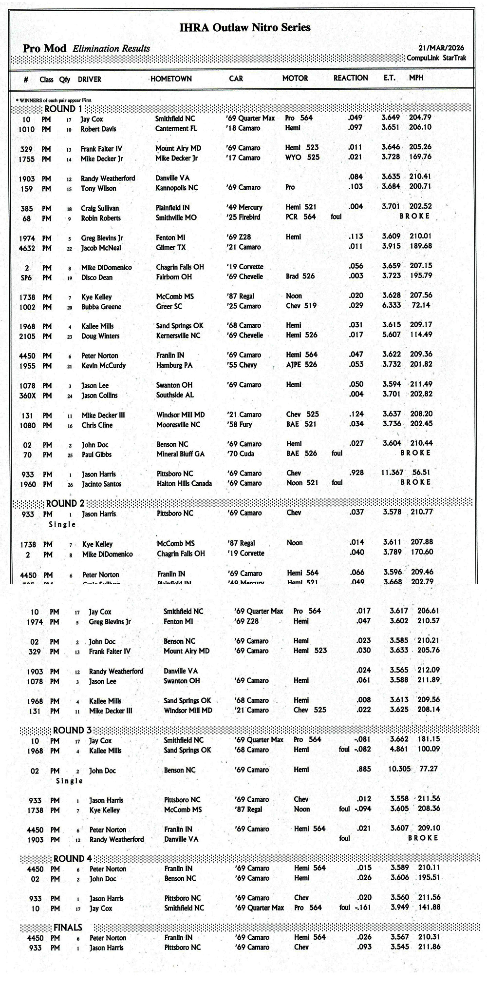 IHRA: 10 Most Recent Entries [ top ] Mar 31- IHRA Acquires Frank Hawley's Drag Racing School Mar 22- BENSON - Top Fuel Final Ladder Mar 22- BENSON - Summary of Eliminations in Top Fuel Mar 22- BENSON - Funny Car Final Ladder Mar 22- BENSON - Summary of Eliminations in Funny Car Mar 22- BENSON - Pro Mod Final Ladder Mar 22- BENSON - Summary of Eliminations in Pro Mod Mar 22- BENSON - Nitro Harley Final Ladder Mar 22- BENSON - Summary of Eliminations in Nitro Harley Mar 22- BENSON - Summary of Eliminations in Pro Stock