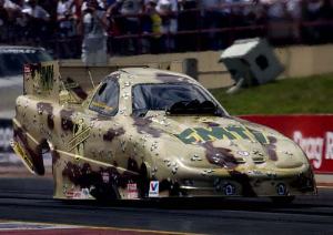 At the season-opening event at Pomona (Ca.) Raceway, Gilbertson’s full armada rolled through the gates in complete camouflage regalia, turning heads with their new show-stopping livery. No where has anybody seen such a distinctive look at 300 mph. Although Gilbertson’s season started slowly, he quickly picked up the pace at the next race in Phoenix, resetting his career best time and speed (4.913 ET, 309.34 mph) in qualifying. At the Mac Tools Gatornationals in Gainesville, Fla., the Gastonia, NC-based team experienced both a high and a low. Although a set of performance-altering weather changes plagued their final attempt and denied them entry into the race, the crew’s resplendent green and gold uniforms earned them the award for Best Appearing Crew. Heading into the spring, Gilbertson battled through a series of races where despite a strong qualifying effort at every stop, an elimination round win eluded him. His lack of racing luck during this time was highlighted during some incredibly close racing. A prime example came at the Bristol event, where Gilbertson, threatening to steal eventual winner Ron Capps’ thunder, saw his upset bid fall shy by an immeasurable 7/1000ths of a second. Sensing a turn-around was within their grasp, his nitro-crew worked harder than ever to get over their first-round blues. As the weather turned warmer, Gilbertson’s TEAM FMTV turned up the heat. At Topeka, Gilbertson made his Memorial Day weekend a memorable one by reaching another one of his goals of the season – breaking down the 4.80 barrier. He came close in qualifying, lowering his career best elapsed time for the second time in 2001 to 4.907 seconds. That mark didn’t stay in the record books for long, as in his first-round victory over Funny Car frontrunner, Del Worsham, Gilbertson shattered the 4.80 barrier, blasting through the quarter-mile in 4.882 seconds at a speed of 306.81 mph. At Columbus’ National Trail Raceway, Gilbertson came close to scoring his second upset win over Funny Car champ John Force in the first round of eliminations. Rocketing off the line first, Gilbertson built on his lead as he raced down the quarter-mile. However, as they neared the finish, Gilberston’s fuel coupe suffered tire spin, allowing Force to just edge him at the stripe. The margin of victory was a mere 27/1000ths of second despite the disparity in elapsed times between Gilbertson’s 4.998 seconds and Force’s quicker 4.947 seconds. Gilbertson’s accelerated pace hastened ever further the next week in Chicago, as he again lowered his career best E. T. in qualifying to 4.858 seconds before being ousted in Round 1 by local favorite, Tim Wilkerson. With the summer winds bearing down, the NHRA tour headed west into the toughest part of the schedule, starting with a three-race tour through Denver, Seattle, and San Francisco. It was the start of exactly what the Stewart & Stevenson racing team had in mind. Bolstered by the acquisition of a sleek new 2001 Pontiac Firebird body, Gilbertson and trusted crew chief, Paul Smith debuted their new ‘Desert Storm camo' Funny Car, which proved to be a fan favorite. On the track, Gilbertson responded by guiding his team to the finals, taking out a notable cast, starting with a hole-shot victory over Scotty Cannon on in the first round, followed by equal successes over Tommy Johnson, Jr. and Dean Skuza. Gilbertson’s reward would be to face 10-time NHRA Winston Funny Car champion, John Force in the finals. With Force recording a lackluster time of 5.225 seconds, it should have been money in the bank for Gilbertson, one of the most consistent cars on race day. Unfortunately, he suffered troubles of his own, with smoke billowing from his rear tires, the result of severe tire shake, conceding the win to his opponent. However, reaching the second final round appearance of Gilbertson’s career provided TEAM FMTV with a welcome dose of positive momentum following their Rocky Mountain visit. Gilbertson leapt three positions in the Winston Funny Car point standings to 13th and focused his attention on a Top 10 assault. Keeping his foot to the floor, Gilbertson scored positive runs in his hometown area of Seattle and Sonoma, running consistently and maintaining his status in the hotly contested points race. At the next event in the idyllic setting of Brainerd International Raceway Gilbertson delivered another serving to his craving for speed. After the first day qualifying in Minnesota, the Gastonia, and N.C. resident stole the headlines with a run of 4.949 seconds to capture the No. 1 position. His quarterfinal finish at this event pushed him to 12th in the points with only seven races remaining on the quarter-mile calendar. After the terrorist attacks of Sept. 11, Gilbertson joined all Americans in mourning. Heeding President George W. Bush’s advice, however, he attempted a return to normalcy by rolling out his camouflage Firebird at the Memphis Motorsports Park when racing resumed, honoring our country by prominently displaying the American Flag in several locations on his 300-mph racer. An immediate hit with fans and crews alike, this show of patriotic pride shined brightly in the pits. Onward Gilbertson’s troops moved north to revisit the Route 66 Raceway in Chicago. The ideal conditions on the track rewarded TEAM FMTV by matching his best qualifying performance of the year. Gilbertson lowered his best ET again by 2/1000ths of a second to 4.856 seconds, and improved his career best miles per hour to 312.46 mph, gaining the No. 9 position. Gilbertson’s experience during the next event in Reading, Pa. could very easily be titled as “A Tale of Two Cities”. After qualifying his TEAM FMTV Pontiac on Friday, he left Maple Grove Raceway to live up to a promise he had made to the employees of Stewart & Stevenson by attending their company’s picnic in Houston on Saturday. As if flying to the Lone Star state and back in one day wasn’t hectic enough for Gilb