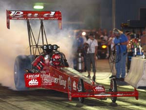 "It is truly an honor to be the first champ since POWERade came on," Dixon said. "They are going to take us to the next level and I am just glad I can give this to Don Prudhomme. He has his own plane and big old houses. Now I can give him the first Top Fuel championship of his career and the No. 1 on the car." Don Prudhomme could not have asked for a better anniversary gift from his Miller Lite Top Fuel team. Prudhomme celebrated his 40th year in drag racing. He spent 32 years in the driver's seat, retiring to team owner after the 1994 season with four Funny Car titles on his resume. His choice in driver and team paid off as Dixon piloted the team to the Top Fuel record for final round appearances and tied the record for wins in a season with Gary Scelzi (2000). Bernstein didn't relinquish the Top Fuel crown easily. The defending champion was down 259 points after the first 11 events of the season. Bernstein had captured two victories in that span, but Dixon had seven going into St. Louis - a track that had eluded Bernstein in the previous five years. Dixon and the Miller Lite team allowed Bernstein back into the race for the title, as they posted a DNQ for the event. Bernstein went on to win, claiming a big victory for his sponsor and cutting Dixon's lead to 157 points. "It was a fight all season with Kenny," Dixon said. "We started off so strong and then we struggled. Kenny kept us honest all year. I told Kenny last year when he beat us in the semifinals to clinch the championship that I was glad he was racing another season. That way I could have a heads-up battle with him. Luckily there was a rematch and I won the rematch." Dixon's struggles lasted just two races. He was back in the semifinals at Seattle, posted runner-up finishes in Brainerd and Indy and was in winner's circle by Memphis. By the end of October, Dixon had clinched the title, celebrating the championship with an event victory to boot at Las Vegas. While he bested Bernstein this season, Dixon didn't forget the second-place finish to the veteran in 2001. "I don't want Bernstein to retire," Dixon said. "I think he should come back and race again next year. Brandon can wait one more year, but I think Bernstein and I should see who can go the best two out of three."