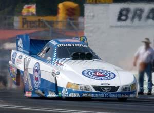 Q: What makes you a good racer and why do you race in the first place? DENSHAM: I absolutely love to race and the fans are out here. That is the bottom line on why you come to the drag races. Sure, you have the thrill of driving the car at 320 mph at 4.7 seconds and it is the ultimate thrill. What really makes drag racing is the fans and the people. It is the only sport that allows them to come down in the pits and be part of the whole scene. Q: How old were you when you got involved with drag racing and what made you venture into quarter-mile competition? DENSHAM: I was dropped on my head as a small child and never recovered. No, it was simple. I grew up in Southern California and we had three nice race tracks and it was the muscle car era. In high school I played football on Friday nights and went to the drag races on Saturday night. It was what we all did. Q: What are your plans for the 2004 season? DENSHAM: Well at this particular moment nothing is set in stone. It appears that if I want to stay out here, which is what I want to do because all of my friends are out here and this is where my family is, I need to find some money and field my own team. Everything is up in the air, nothing is decided. I would love to stay out here forever. Obviously I won't be able to drive the car forever, but I don't see any time soon that I will want to quit. Especially when Chris Karamesines at 73 years old is running a career-best 4.60 at Sonoma (Calif.) and there's Kenny Bernstein, who won't let anyone print his age, but he is as competitive as ever. I don't see anything in the near future that would absolutely tell me that I don't want to drive the car. I still have the desire to do it. Obviously if I thought I was hurting the team I would be the first to step down, but I want to be part of this. I feel I have a reasonably good working knowledge of how the car works and I would probably be some sort of an asset to my own team or someone else's team in that capacity on how to make the car run. Q: Do you think you will be better able to run your own team after having spent time with Force's three car operation? DENSHAM: The good thing is that I learned some things. One thing I learned is that you need a lot of money. It all revolves around money. I've learned from here that you reach certain plateaus with the amount of money that you have available. I look back at what I was capable of doing with the little amount of money that I had and it makes me more proud of those years than I was at the time. I didn't realize I was running with such a handicap. You were just foolish enough to say that I had a car and I'll go race. So when I look back upon that, I think we did awful good especially with what we had to work with. The overall competition and the fields that are out here now, the cars that are out here, are probably as good as it has ever been, so obviously it is going to be tougher than it was before. All you can do is try to field the best team you can with what you have. Q: What do you think about the level of competition in Funny Car racing right now? DENSHAM: It is obviously as high as it has ever been. Look at the record bump spot (during the U.S. Nationals). There are a lot of great teams and cars out here. There are obviously those that are a little better, a little better funded, a little better equipped with better personnel at the top. Those that aren't are probably going to be toward the bottom. But that is the nice thing about drag racing because on any given day you can win. Q: What do you think about going back to Memphis Motorsports Park? DENSHAM: I love going there. I've had pretty good success there. It's been said that my first final round was at Brainerd, but it wasn't. My first runner-up was in Memphis. Then my first national event win was there. Memphis is one of the tracks I look forward to racing at because I've had success there. I hated going there in the middle of the summer, but they changed the date of the race and I think I will always have a soft spot in my heart for Memphis. Q: How do you think the season is going for the Auto Club Ford Mustang team? DENSHAM: The year is great. Working with Jimmy Prock has been one of the highlights of my career. He is a great young man, a lot of fun to work with and he is extremely talented. I think we have another win or two left in us. That's the plan. Q: Describe your relationship with Jimmy Prock. DENSHAM: It's terrific. Like any situation it probably took us a couple of months to jell together. Probably even four or five months the first year. He came from a dragster, I came from a Funny Car but we were both thrown into this thing pretty quickly. I think it took him a little while to understand that I knew a little bit about the car and that I wasn't just a normal driver like he had had before. It's really nice and I feel very honored that he wants to talk about the tuneup with me and get an opinion. He's absolutely incredible. He is so meticulous and so dedicated and works so hard and yet he has the same attitude that I do that if that particular run didn't work out on that particular day it wasn't like we failed at trying to cure world hunger and 35,000 people died. We failed at making a good run with a race car, which means we will work harder and do better the next time.