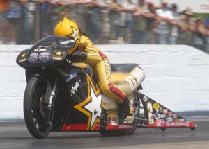 Kenny Bernstein is still heralded as the 'King of Speed' for his historical 301.70 mph pass from the 1992 edition of the Gatornationals. Just who will accomplish the first run of 6.999 seconds or quicker on a Pro Stock Motorcycle is the question category experts have been pondering during the offseason. That question may be answered during the first qualifying session on Friday, March 18 at 11:30 a.m. With the right weather combination - preferably crisp, cool and overcast conditions - the barrier will likely be broken. With more than five bikes capable of achieving the performance, it may come down to luck of the draw in the qualifying order. NHRA rules determine qualifying order for the first session based on last year's final point standings, which means Rickey Gadson (did not compete), Ryan Schnitz (31st) and Chip Ellis (17th), all three predicted as leading top-10 points contenders for 2005, will have the first shot at a permanent spot in the NHRA record book and collecting the hefty $10,000 bonus offered by Mickey Thompson Tires. Overall, the first eight riders in the sixes will become members of the exclusive NHRA Mickey Thompson 6-Second Pro Stock Bike Club.