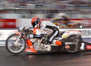 Hines, who became the first rider to enter the NHRA Mickey Thompson 6-Second Pro Stock Bike Club yesterday, feels that he might have company tomorrow. The second rider to enter the 8-position club receives a $3,000 bonus. "I think the track was there for more bikes to get in the sixes but it looks like people just missed the set-up," Hines said. "I know we did. We lost it all in the first 60 feet on both runs today. We all went from our cold weather tune-up to our warm weather tune-up in one day. By tomorrow, there might be a bunch of sixes."