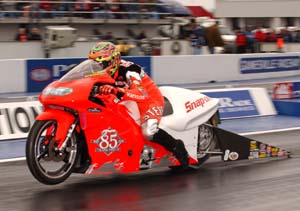 Johnson rolled to easy victories over red-lighting Chip Ellis and Andrew Hines and used a holeshot start to hold off the quicker U.S. Army Suzuki of Antron Brown before using more horsepower to drive around Treble in the final. "I just found out the POWERade rules have changed; the Motorcycle season is now over and the champion will be crowned Monday," Johnson said jokingly. "This is the Gatornationals. It's our season opener and such a big race. I am thrilled to win it." The NHRA POWERade Drag Racing Series continues with the 18th annual O'Reilly NHRA Spring Nationals, April 8-10 at Houston Raceway Park. Sunday's final results from the 36th annual Mac Tools NHRA Gatornationals at Gainesville Raceway. The race is the third of 23 in the $50 million NHRA POWERade Drag Racing Series: Top Fuel -- Doug Kalitta, 5.182 seconds, 296.24 mph def. Larry Dixon, 5.925 seconds, 169.81 mph. Funny Car -- Whit Bazemore, Dodge Stratus, 4.897, 315.67 def. Bob Gilbertson, Chevy Monte Carlo, foul. Pro Stock -- Jason Line, Pontiac Grand Am, 6.716, 205.90 def. Dave Connolly, Chevy Cavalier, 6.749, 205.66. Pro Stock Motorcycle -- Steve Johnson, Suzuki, 7.139, 187.26 def. Craig Treble, Suzuki, 7.161, 185.95. Top Alcohol Dragster -- Aaron Olivarez, 5.408, 260.41 def. Ashley Force, 5.401, 267.37. Top Alcohol Funny Car -- Bob Newberry, Chevy Monte Carlo, 5.591, 256.26 def. Mark Billington, Dodge Avenger, 5.734, 253.73. Competition Eliminator -- Tony Stephenson, Chevy Cavalier, 7.942, 147.68 def. Bo Nickens, Dodge Neon, 7.655, 154.40. Super Stock -- Joe LoCicero, Chevy Camaro, 9.604, 130.77 def. Dan Fletcher, Camaro, 9.862, 124.06. Super Comp -- Lindsey Wood, Dragster, 8.908, 180.07 def. Greg Kamplain, Dragster, 8.872, 159.40. Super Gas -- Jeremy Preston, Chevy Chevette, 9.923, 137.97 def. Jacklyn Gebhardt, Chevy Bel Air, 9.886, 153.68.