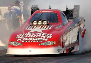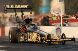 Schumacher's much-anticipated run at a national record will have to wait another day as his 4.490 at 328.54 mph in his U.S. Army dragster was well off the national mark of 4.437 he'll need to better to gain the valuable bonus points a record is worth. Nevertheless, he drives the only dragster in the 4.4-second range so far. "Our goal was to do a back-up run (for the record)," Schumacher said. "We wanted a 4.46 or 4.45 but the car was extremely weak in the middle. Saturday night will be the session. We'll be running at night so it should be perfect. Alan [Johnson, crew chief] is the best there is at getting the most out of the track so I guess a 4.49 was the best we could have hoped for there." Brandon Bernstein, who remains mathematically alive for the Top Fuel title, is second after clocking a 4.519 at 330.47 mph in his Budweiser/Lucas Oil dragster. Kalitta is fifth with a very conservative 4.546 at 326.87 mph in his Mac Tools dragster.