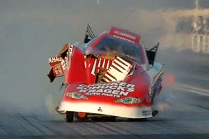 Worsham retained the Funny Car lead with his previous pass of 4.712 seconds but was involved in a spectacular crash Friday. His Checker Schuck's Kragen Chevy Monte Carlo's engine exploded and the car went out of control and flipped into the sand traps at the end of the track's shutdown area. He emerged from his car under his own power, but as a precaution he was transported to a local hospital for observation. "I'm sore, but I'm more bummed than hurt," Worsham said. "It just blew up down there and there was no way for me to get my hand to the parachute lever, so I was along for the ride. When it finally stopped tumbling, I just got out and walked away from it, already mad about what had happened. Here we are, still the No. 1 qualifier and we're running great, and this has to happen. I know the team is already preparing the back-up car, so we'll just have to see how I feel."