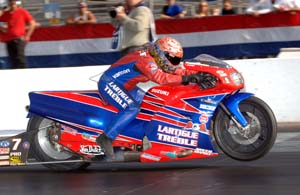 "This has been a blast," Anderson said. "Jason won the championship (two weeks ago) in Vegas so we were able to come in here and have fun and just race like weekend warriors with nothing to lose. It's cool that it came down to us in the final and I'm glad the champ let me beat him. You don't get many chances to race like this at this level." Treble broke a two year winless drought when he ran away from challenger Tom Bradford in the Pro Stock Motorcycle final. Treble finished with a 7.072 at 190.81 mph on his Team Tigue Suzuki against Bradford's Hal's Speed Shop Buell, which ran 7.301 at 182.06 mph.