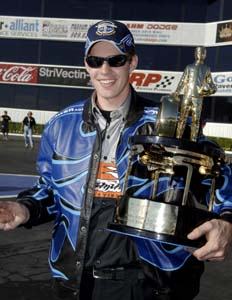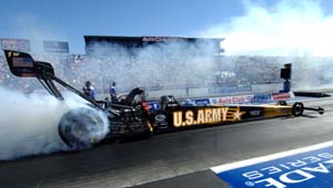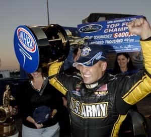 There was only one way for Schumacher to win this championship -- win two more rounds than Kalitta on the day and set a national elapsed time record, which is worth 20 bonus points. He pulled it off by beating teammate Melanie Troxel in the final to completely erase a deficit that was 336 points at the season's mid-point. "I probably felt better today than I ever had in my life because the pressure was so high that it was too much to even comprehend," said Schumacher, who joined Joe Amato as the only NHRA Top Fuel drivers to earn three consecutive titles. "I don't know that there's ever been a single pass in drag racing where so much was on the line in one round. To win it like this is unreal. It's beyond anything that you can ever dream up." Kalitta had a chance to clinch the title in the semis when he ran against Troxel. Despite running a quicker time -- 4.500 to 4.502 -- Kalitta lost on a holeshot in his Mac Tools dragster. In the final, Troxel left on Schumacher but his U.S. Army dragster quickly made up the difference and took the win, the record, and the championship. "What can you say about Alan Johnson," Schumacher asked. "He's simply the best crew chief and tuning mind ever, period. No one comes close. To pull off what he just did should end all discussion on the subject. He's the best."