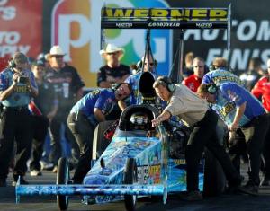 "My goal is to keep doing good, keep the sponsors happy so I can keep doing this and make sure these guys have a way to keep their house notes paid." As to his primary sponsor, to follow Werner Enterprises, which was with him for those championships, Millican says there will be an announcement coming in a few days. Now, don't tell Clay I told you, but I did see him and the crew putting some new decals on that pretty light blue rail in the pits. They read Torco Fuels, but you didn't read that here, okay? Now, about that full NHRA schedule: "We're going to run it one race at a time. Actually, the reason we wanted to test here was this was a new Brad Hadmen car and we have a lot of fuel system things we want to try. Evan Knoll and Kenny Koretsky (car owner), we're friends and they decided the sooner we go test, the better. "I guess you could say this is like a pre-pre test session."