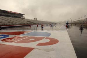 The Pomona racing surface typically takes at least 2-1/2 hours to dry, even with two jet dryers, so the earliest racing could begin