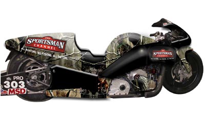 It's a perfect alliance between Bradford, an avid hunting and fishing enthusiast, and a channel dedicated to the sportsman. "My background is a natural for The Sportsman Channel," said Bradford. "Basically, I'm passionate about three things in life: pro stock motorcycle racing, hunting and fishing, and my family." The Sportsman Channel corporate office is based in New Berlin, Wisc., which is also the home base for Bradford and longtime associate sponsors Hal's Speedshop, Hal's Harley-Davidson/Buell and Stitch-it-Embroidery. "Our mutual sponsors introduced us and were ultimately the connection there," said Bradford, who worked with The Sportsman Channel's Sr. Vice President, Todd Hansen, to form a marketing partnership. "This is a great opportunity for The Sportsman Channel to form new partnerships and reach out to enthusiasts in other markets," said Hansen. "Tom is an excellent performer and we are excited to meet his supporters at the races." "My team is obviously very, very enthused about this relationship with a sponsor outside of the motorcycle and automotive industries," continued Bradford. "And we're looking forward to introducing NHRA fans to The Sportsman Channel." The Sportsman Channel and Bradford Racing concept motorcycle is fully draped in Realtree(r) All Purpose camouflage pattern. Bradford will wear a similar-looking driver suit and the trailer will also carry all sponsors logos while integrating the camouflage pattern. "The bike is really, really cool the way we're doing it. It's done in a true sportsman theme which is something that will certainly be unique and interesting to all the NHRA fans," said Bradford. The Sportsman Channel is dedicated to the over 47 million sportsmen in the U.S. who demand 24/7/365 hunting and fishing programs. The strict programming guidelines don't allow for infomercials, motorsports, bull riding, hiking, cycling or any other variety programming-just tried and true hunting and fishing programming. No other channel can claim this. And few competitors can claim a first full year in NHRA POWERade competition like the year five-time AHDRA national champion Bradford and his team had in 2006. They nailed down a number one qualifier in St. Louis, became the fourth member of the exclusive Mickey Thompson 6 Second Club in Sonoma, made the Ringers Gloves Pro Bike Battle in Indianapolis, finished sixth in the Full Throttle NHRA Pit Crew Championship, and eighth in the POWERade Point Standings. And Bradford finished the season off with a final round appearance in Pomona. "I am so fired up about 2007, I just can't wait for Gainesville!" said Bradford, who starts the new season March 15-18 at the ACDelco NHRA Gatornationals at Gainesville Raceway, Gainesville, Fla. Tom thanked The Sportsman Channel, Red Line Oil, Balbayis Asset Consulting, Hal's Harley-Davidson/Buell, Stitch-it-Embroidery, CRD Inc., MicroBlue Racing, Vanson Leathers, S&S Cycle, Buell Motor Co., T-N-S Machining, Autolite, Simpson, and EBC Brakes for their support of the Thunder Eagle/Tom Bradford Racing Team.