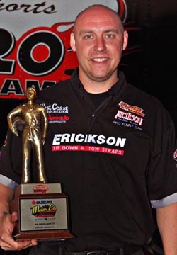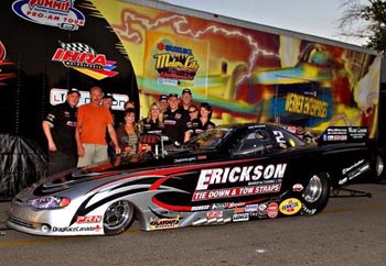 Rather than travel, the biggest problem to being based in Canada was the poor exchange rate during the 1990s and first half of the 2000s, Atchison says. "Initially, financially it was a struggle because the Canadian dollar was weak," he says. But, he says, dealing with the problems of being based in Ontario is something that he just has to deal with if he wants to be part of IHRA drag racing. "It's like walking uphill to get to school," Atchison explains. "It's something you have to do. You realize you're going to have to drive a little farther to do some testing." Like many men who grew up in Ontario, Canada, Atchison is a hockey fan and a fan of the Toronto Maple Leafs. But unlike most people from Ontario, Atchison is also a fan of the Philadelphia Eagles of the National Football League. "I've been an Eagles fan forever," Atchison says. "I liked to watch Reggie White, and Randall Cunningham was a great quarterback to watch." White, a defensive end, played for the Eagles from 1985 to 1992; while Cunningham played quarterback for the team from 1985 to 1996. "He (Cunningham) was one of the few quarterbacks who would run," Atchison says. "It's always fun to root for a team that has a lot of heart." "We all picked NFL teams to root for," says Atchison. "We played the NFL-style rules in high school." Because the Canadian Football League rules call for only three downs instead of four, as in the NFL, the Canadian game is more oriented toward passing and that is not good for young arms. Atchison has been married for two-and-a-half years to his wife, Julie. In addition to working as the pit reporter for Speed Channel's coverage of IHRA events, Julie also does weather reports and other features for a TV station in London, Ontario. After winning the IHRA Alcohol Funny car championship in 2003, 2004 and 2005, Atchison had a disappointing season in 2006, when he finished in second place in the standings, 106 points behind Mark Thomas. "We tried a lot of new things in 2006 and we hit a few bumps," he says. "There were a lot of guys who made changes and we all struggled with consistency. We thought it would take half the season to get the car sorted out and it was about halfway through the season and the car turned around."