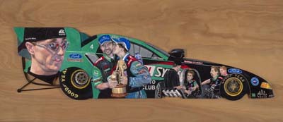 Eric Medlen, one of the rising stars of the NHRA POWERade Drag Racing Series and the first of JFR's Next Generation drivers, succumbed last March to injuries suffered in a Funny Car testing accident at Gainesville, Fla. The portrait study, by artist Paul Hinds, is entitled "Full of Life" and, according to Thermos, the founder of NOS (Nitrous Oxide Systems) and president of Nitrous Supply, Inc., was created to honor the memory of a driver, family and team that has been an inspiration to the entire drag racing community. In addition to his work in race car safety, John Medlen is an accomplished crew chief who won the 2003 NHRA championship with driver Tony Pedregon and who, with his son driving the Castrol SYNTEC Ford Mustang, won six times in three years and never finished outside the Top 5 in the NHRA Funny Car standings. Medlen presently is crew chief to rookie driver Mike Neff, who this weekend is trying to qualify for his second race at the wheel of a second Castrol GTX Ford Mustang, companion to the Mustang driven by Rookie-of-the-Year contender Ashley Force. Hines' other portrait subjects in drag racing include Force, the 14-time Funny Car Champion presently recovering from injuries suffered in a Sept. 23rd crash in Dallas, Texas, and multi-time World Champions Don Prudhomme and Kenny Bernstein. To accurately reproduce the colors in Medlen's uniform, Hinds used a combination of oil stains, pencil and art marker. The painting was the second major tribute to Medlen during the final weekend of the 2007 season. On Thursday, he was named the first winner of the Mike Aiello Spirit of Drag Racing award presented by 1320 TV. Named for the late motorsports photographer, the award is presented for contributions to the sport. Funny Car driver Jack Beckman, a close friend of Aiello's, made the presentation on behalf of Susan Wade of 1320 TV.