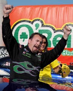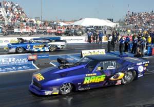 In a repeat of last year's final, Hernandez's AMS Staff Leasing Camaro blew the doors off Tony Pontieri's Quality Plus Compressors '57 Chevy to win with a 5.934 at 242.36 mph to Pontieri's 6.318 at 193.88 mph. "It was exactly the same because those poor guys were over there swapping motors again before the final round, just like last year," Hernandez said. "This time they managed to get up there and give us a race and I was happy to see that. I told them we'd wait as long as we could because we all know what an engine swap is like when you're under the gun. Last year I had a single run, which is never as much fun. "We had a little conflict last week and didn't get to race in Atlanta so we really felt a lot of pressure to come in here and earn as many points as possible. We did everything but set a national record and we managed to move back to where we were before Atlanta so we're very happy."