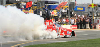 In front of a Coca-Cola 600 pre-race crowd of nearly 100,000 Neff laid down one of the most impressive burnouts in recent memory on pit road. Fans were on their feet when the Old Spice Ford Mustang was simply started and after it made a quick warm-up hop they were whipped into a frenzy of anticipation. Neff backed up and positioned his 8,000 hp fuel coupe for the first full powered NHRA burnout in the history of Lowes Motor Speedway. When Neff hit the throttle a massive cloud of smoke bellowed from his Mustang and as he powered down pit road past many of the stars of NASCAR the roar of the crowd was deafening. "That was awesome. Making that burn-out was incredible. I had to get off the throttle because I could feel my Old Spice Mustang starting to really pull. I think it was about to hook-up on pit road. When I got to the end of pit road there were people everywhere congratulating me on putting on such a great show," said Neff. "Force really wanted to do the burn out but he knew it was important for Old Spice to be the focus and I really appreciate him giving me the chance to get in front of this many people to show off the power of the NHRA. Everyone has been great and I know they are really looking forward to seeing us back here in September. Hopefully giving them a little taste of what they can see will help them sell some more tickets," added Neff. Neff's burnout was part of track president Humpy Wheeler's trademark epic opening ceremonies that included Apache helicopters, Howitzer cannons, paratroopers, and more music than most concerts.