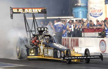 His win at the Mac Tools U.S. Nationals was also the 52nd win of his career, tying him with Joe Amato for first on the all-time NHRA wins last. You said after your win on Monday, that the magnitude of what you accomplished has not sunk in; has it sunk in now, and how do you balance wanting to acknowledge and revel in all of these historic achievements, while at the same time remaining focused on the six races left and a 30-point lead? TONY SCHUMACHER: We've been very good at staying focused through a lot of great achievements in the years past, and with the crew, those Army guys are so good at staying focused in the tough times. You know we make it a point before each race to get together and say, 'Guys, this is the time to focus. We've come way too far to leave anything on the table right now.' So we've won some great championships and we've won on the last run of the year coming back from 300 points, we have closed the biggest deficit ever. We have several records, and the last record in the world we want to add to our list is losing 550 points with six races to go. You know, the Countdown is the Countdown. We extended our lead to 30 points now, and we need to get it back. We will go out and we will be a machine and we will do whatever it takes to win that race within the rule books, and we will be hard to beat. We have a great team. We have some things to overcome now with the loss of (crew chief) Alan Johnson next year, we are going to have to dig deep to make sure that we can I think win as many as we can while still having a great crew chief like that.