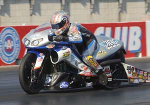 "We're still not really sure where that 6.92 came from," said Rivas, who finished second in the point standings, five points behind Krawiec. "I knew that we had left together and by the time I plugged third gear he had completely dropped back; I thought he had broken. We hit the rev limiter at the finish line so I knew it either had been a really good run or that it had broken the transmission. I did what I was supposed to do as a rider. I took out the reigning world champ and kept him from having the number-two spot, and I feel fantastic about that." The 2009 NHRA Full Throttle Drag Racing Series season opens Feb. 5-8 at Auto Club Raceway at Pomona. Sunday's final results from the 44th annual Automobile Club of Southern California NHRA Finals at Auto Club Raceway at Pomona. The race is the final of 24 in the NHRA POWERade Drag Racing Series- Top Fuel -- Larry Dixon, 3.833 seconds, 300.93 mph def. Rod Fuller, 3.839 seconds, 310.48 mph. Funny Car -- Cruz Pedregon, Toyota Solara, 4.087, 303.30 def. Ron Capps, Dodge Charger, 4.078, 304.53. Pro Stock -- Greg Anderson, Pontiac GXP, 6.615, 209.20 def. Kurt Johnson, Chevy Cobalt, foul. Pro Stock Motorcycle -- Chris Rivas, Buell, 6.929, 191.95 def. Eddie Krawiec, Harley-Davidson, 7.009, 190.46. Top Alcohol Dragster -- Jim Whiteley, 5.317, 267.91 def. Bill Reichert, 5.632, 210.67. Top Alcohol Funny Car -- Mick Snyder, Ford Mustang, 5.591, 258.71 def. Steve Harker, Chevy Monte Carlo, broke. Competition Eliminator -- Dan Fletcher, Chevy Cobalt, 8.053, 163.75 def. David Connolly, Pontiac GTO, 8.025, 149.00. Super Stock -- Byron Worner, Chevy Camaro, 9.884, 133.07 def. Frank Grossi, Pontiac Sunfire, 9.280, 143.23. Stock Eliminator -- Lee Zane, Pontiac Firebird, 13.516, 70.52 def. Mike Johnston, Firebird, foul. Super Comp -- Anthony Castillo, Dragster, 8.872, 179.25 def. Robert Naber, Dragster, foul. Super Gas -- Dave Coapstick, Chevy Camaro, 9.901, 154.62 def. Val Torres Jr, Pontiac Firebird, 9.901, 155.49. Summit Super Pro -- Bart Nelson, Mullis, 7.510, 175.16 def. Mark Padgett, Mullis, 7.201, 181.25. Summit Pro -- Steve Kelly, Camaro, 10.274, 122.30 def. Brock Moshier, Vega, 9.191, 144.16. Summit Sportsman -- Michael VanDenHeuvel, Cutlass, 12.207, 109.56 def. Mike Griggs, foul. Summit Bike -- Tom Klemme, Kawasaki, 8.904, 142.54 def. Chad Isley, Kawasaki, 9.616, 133.84