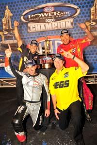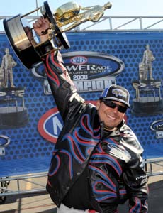 Meanwhile, Eddie Krawiec won his first POWERade Series crown in Pro Stock Motorcycle, and did so without winning a race during the season. He joins Rob Bruins, the 1979 Top Fuel champ, as the only drivers in NHRA history to win a season title without earning an individual race victory. After Pedregon won his first round meeting against Jerry Toliver, he secured his first title when his two closest challengers lost in the first round. Season-long leader Tim Wilkerson fouled against John Force and then Robert Hight lost to Pedregon's brother, Tony.