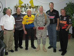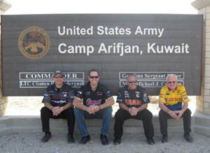 Six-time NHRA Pro Stock champion Warren Johnson, two-time NHRA Pro Stock champion Jim Yates, Top Fuel veteran Cory McClenathan and 2006 Pro Stock champion Jason Line (who joined the group for the first time this year) represented GM and the sport of drag racing during the troop-morale mission to Kuwait and Germany. The drivers distributed over 1,500 goody bags that included racing caps, tee-shirts, racing decals and other items, signed an even larger number of photos (supplied by the USO), and brought a precious few minutes of home to everyone they met. Many NHRA sponsors contributed to the gift bags and the troops were very appreciative of what they received. Jeff Anthony served as USO tour manager and provided valuable guidance for the drivers' group during their stay in Kuwait.