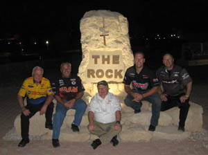 After lunch with the troops at the Camp Arifjan dining facility, the group journeyed a few miles east to Camp Patriot, Kuwait Naval Base, for a commander's welcome briefing, and while there, LTC Robert Lesher presented Certificates of Appreciation to each member of the drivers' group. The drivers were then entertained with an exciting 45-minute ride aboard Navy gunboats around the Kuwait Navy Base harbor, and then signed autographs for personnel at Camp Patriot before returning to their hotel. On Tuesday, the group made their way west out of Kuwait City to Ali Al Salem Air Base, which is about 40 miles from the border with Iraq. Ali Al Salem is a Kuwait air installation, but it is shared with U.S. Army and Air Force units, and it's where many U.S. troops come for a few days to unwind before flying home. Ali Al Salem is nicknamed "The Rock" by the troops stationed there because of its strategic vantage point high above the Kuwaiti desert.