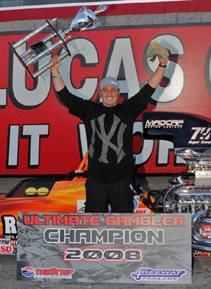 Last weekend, Biondo wrapped up yet another banner season with yet another huge victory, as he claimed the $42,000 winner-take-all Ultimate Gambler event at The Strip at Las Vegas Motor Speedway. The Ultimate Gambler, in which Biondo was runner-up in 2007, is the marquee event of the facilities Thanksgiving Bracket Nationals event, which was contested throughout the week. Rather than make the cross-country tow to Las Vegas from his home near New York City, Biondo made arrangements to fly to the event and drive for friends and fellow competitors Chris and Justin Lamb. Biondo purchased two entries into the 42-car Ultimate Gambler event, a shootout loaded with the top names in bracket racing from coast-to-coast. Biondo nearly pulled off an epic feat, as he came within .003-of-a-second of having both his entries in the final round of the biggest bracket event on the West Coast. After mowing through the first three rounds of competition (knocking out the likes of J.R. Leerkamp, Andy Morris, John Phlegar, and good friend Kyle Siepel), Biondo had both of his entries in the event with just six cars remaining. There, he and two-time defending NHRA Super Comp Champion Shawn Langdon squared off with a semi-final bye run at stake. Biondo, as would be expected, was clutch with a .008 reaction and dead-on 4.740. Langdon, however, posted a stellar run of his own, with a .005 and dead-on 4.840 to get the win and the bye into the final round. On the other side of the ladder, Biondo used a .011 and 4.753 on his 4.74 target to oust Idaho standout Dan Lafferty. In the semi-final round, Biondo and perennial bracket and super-class threat Jeff Cheney locked horns, with Biondo posting another clutch .009 package (.003, 4.756) to advance to the final for a rematch with Langdon. In the final, Biondo posted yet another telepathic reaction, .006, and backed off the throttle to take the victory with a 4.806 on his 4.77 dial over Langdon's .018 induced 4.893 (4.85 dial). "What a gratifying feeling to come out on top of a race like this," said Biondo of the 42-car shootout with an entry list that read like a 'who's who' of sportsman racing. "I want to especially thank the Lamb family and Kyle Siepel for allowing me to fly in and drive their cars." As if the Ultimate Gambler triumph weren't enough, Biondo also drove good Siepel's dragster to a runner-up finish in a special "Race for a Dragster" event earlier in the weekend. The Ultimate Gambler victory put an exclamation point on Biondo's incredible 2008 campaign. After kick starting his season with a Stock victory at the IHRA Sportsman National event at Immokalee Regional Raceway, Biondo went on to appear in five NHRA national event final rounds, winning three: Stock at Gainesville, Super Stock at St. Louis, and Stock again in Englishtown. Meanwhile, Biondo has remained true to his well documented schedule of running national events and big money bracket races almost exclusively, and attended just six bracket events all season. In those six appearances, Biondo's credentials are nothing short of amazing. At the JEGS U.S. Open in July, Biondo made his first bracket appearance of the season a memorable one: winning the opening $10,000-to-win event and taking runner-up honors to Jeg Coughlin, Jr. in the $20,000-to-win event on day 2. A month later, he made an appearance at the AA Auto Salvage Superbucks weekend at Atco Dragway. There, he made another hefty deposit, scoring a $25,000 victory on the event's opening day. In September, he made the journey to Memphis, TN for the annual Million Dollar Race. There, he again opened competition with a victory, taking home a new dragster and motor in a special 64-car shootout on Thursday evening. Two days later, Biondo made another splash, advancing to the final 14 cars in the Million Dollar Race before falling by less than a thousandth of a second to eventual winner Dave Triplett. November actually brought the only non-winning appearances of his bracket season, as Biondo ran a limited portion of the annual Winter Series events in Bradenton, FL and Valdosta, GA. In five days of competition, Biondo was able to muster "only" a semi-final finish in a $15,000 main-event at Bradenton. Following that outing, he made his appearance in Las Vegas worthwhile, claiming his fourth big money bracket triumph, and second bracket runner-up of the season in extremely limited appearances. Biondo once again thanked his family and co-workers at Biondo Racing Products (www.BiondoRacing.com), the family owned business is at the forefront of racing technology offering competitors the latest electronics and other accessories designed by racers. Biondo was grateful and thankful in recapping his 2008 season. "It was an exciting and successful season. I have a lot of people to thank for giving me the opportunity to continue to compete at a high level. I would especially like to thank the following companies for making 2008 so successful: BiondoRacing.com, JEGS.com, K&N Filters, Sparco Safety Equipment, RacePartDepot.com, Goodyear Tires, ATI Transmissions and Converters, Kooks Headers, and PAR Racing Engines."