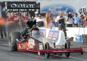 Tony Schumacher in his Army dragster qualified number two during the final session of qualifying with a 3.826-second pass at 314.46 mph. Antron Brown's Matco dragster run from Friday night of 3.830 seconds at 313.80 mph put him in the number three spot. Rookie Spencer Massey, in the U.S. Smokeless Tobacco dragster, qualified number four with a run of 3.847 seconds at 310.27 mph. Brandon Bernstein qualified number five with a 3.875 second pass at 308.07 mph, and he ran the fastest pass of the event during the final qualifying session in his Budweiser/Lucas dragster, at 316.38 mph.