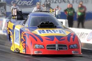 CHANDLER, Ariz. -- Larry Dixon, Ron Capps and Mike Edwards maintained the number one qualifying positions at the 25th annual Lucas Oil Slick Mist NHRA Nationals. Dixon driving the Alan Johnson Al-Anabi Racing dragster stayed number one with his time from Friday at 3.807 seconds at 313.95 mph. Capps qualified number one in his NAPA Auto Parts Dodge Charger R/T with his 4.023 seconds at 305.63 mph from Friday. Mike Edwards track record setting pass of 6.605 seconds at 208.52 mph from Friday held on to be the number one qualifier in Pro Stock.