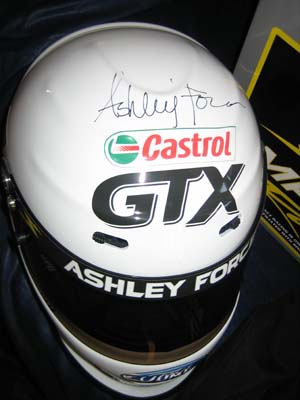 A display quality helmet modeled after Ashley Force Hood's 2010 design autographed by Ashley Force