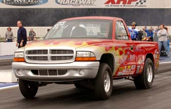 "It started out with my dad working on transmissions and doing some development work back in the 70s and 80s when he and his brothers, Greg and Pat, were running their own car," said Darren. "Word got out, and he started doing transmissions for people here and there. Over the years he built a bigger and bigger customer base, and in the late 90s, he quit his work with the county of Los Angeles to pursue the business full time. I joined him in 2001 and now I'm in charge of the building of the new transmissions for our Stock, Super Stock, Comp, and Sportsman bracket racing customers." Darren has plenty on his plate helping out at Pro Trans, and of course the business always comes first, but it would be a mighty task to keep the Division 7 challenger away from the race track. At just six months old, he was celebrating in the winner's circle in honor of his Uncle Greg's 1982 Winternationals win, and Darren's passion for the sport was launched. He bracket raced at the local track in high school and at the end of 1999 put together a car to compete with in Stock. Right away the young racer was going rounds in his DT/SA '98 Dakota and posted a semifinals finish at the season-opener in Pomona, and at the Phoenix divisional event soon after, he added three more round-wins to his tally.