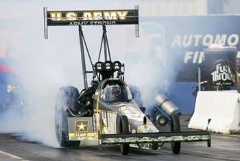 "Conditions weren't what they were [for Friday's second session]," Force said. "I knew it'd run an 0, but I didn't think it'd run an .06. I saw Neff turning on some screws when he went over the car after I backed up from the burnout. He took a long time and I said, 'Don't run me out of gas.' I don't know what he did - they never tell me - but I have a lot confidence." Schumacher powered his U.S. Army dragster to a 3.818 at 317.05 to earn the 59th No. 1 effort of his career and fourth at this event. He grabbed the top spot away from Friday leader Doug Kalitta, whose performance of 3.825 at 317.05 in his Technicoat dragster was good enough for second.
