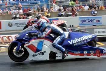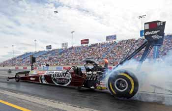 In Funny Car, Robert Hight followed up his success of three consecutive race wins for the season by racing to the top of the field. Hight drove his Auto Club Ford Mustang to a 4.067 at 313.15. It's his fourth of the season and 36th of his career. "It doesn't change you mindset," said Hight, who was set to race teammate John Force before Cruz Pedregon was disqualified. "We don't race the other guy. We go up there and race the conditions. Jimmy knows what he can get away with based on the conditions. We go up there and do our deal. It was just like in Topeka when we had a single we would have looked stupid if we would have gone up there and smoked the tires. What did we do we went out there and set low ET for the whole weekend. There is no difference in how we approach racing Justin (Schriefer) or John tomorrow morning. If I try to make a difference I'll be late on the light. You have to go up there assuming the other guy is going to be perfect. You just have to do your job. If you don't he is going to beat you."